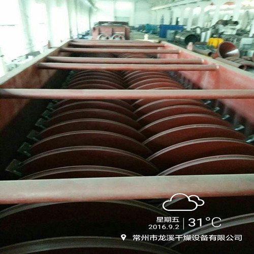 空心轴上密集排列着楔型中空桨叶,热介质经空心轴流经桨叶。单位有效容积内传热面积很大,热介质温度从-40℃到320℃,可以是水蒸汽,也可以是液体型:如热水、导热油等。间接传导加热,没有携带空气带走热量,热量均用来加热物料。热量损失仅为通过器体保温层向环境的散热。楔型 桨叶传热面具有自清洁功能。物料颗粒与楔型面的相对运动产生洗刷作用,能够洗刷掉楔型面上附着物料,使运转中一直保持着清洁的传热面。桨叶干燥机的壳体为W型,壳体内一般安排二到四根空心搅拌轴。壳体有密封端盖与上盖,防止物料粉尘外泄及收集物料溶剂蒸汽。出料口处设置一挡扳,保证料位高度,使传热面被物料覆盖而充分发挥作用。热介质通过旋转接头,流经壳体夹套及空心搅拌轴,空心搅拌轴依据热介质的类型而具有不同的内部结构,以保证**的传热效果。
